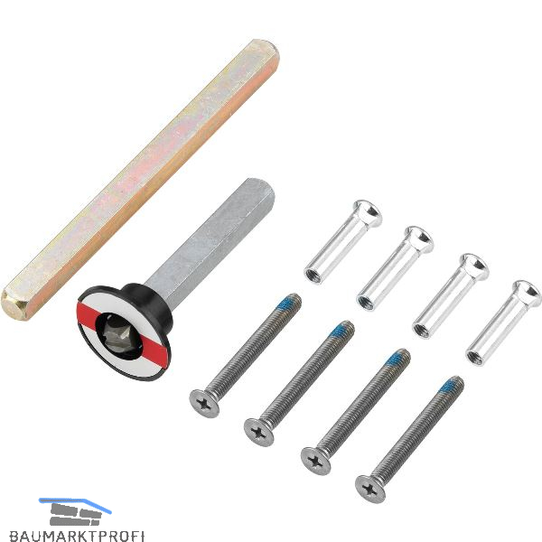 Lieferumfang: 1 Vollstift mit Nut 135 mm, 1 Riegelstift mit Schauscheibe Notentriegelung 7 x 75 mm, 4 Senkschrauben M5 x 65 mm, 4 Hülsenmuttern M5 x 26 mm