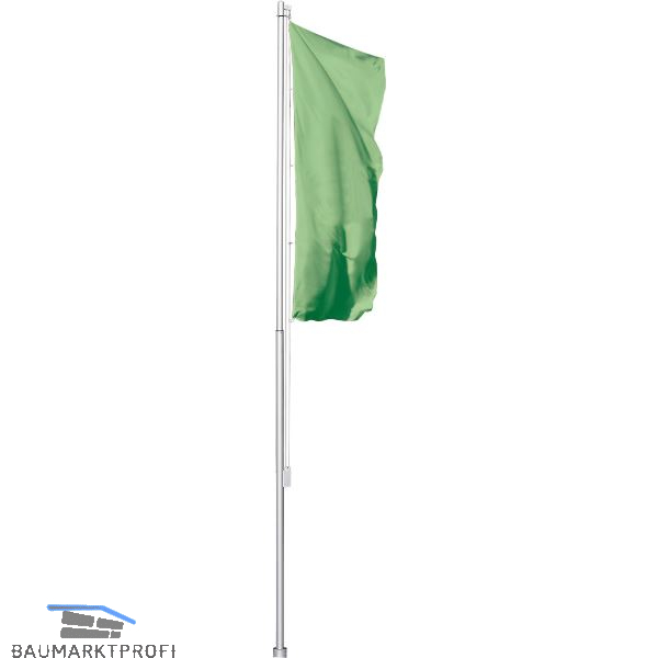 Fahnenmast zylindrisch, 2-teilig, außenliegende Hissvorrichtung, abgesetztes Profil. Spannung des Hissseils durch Innensechskant-Stellschraube, leichte Hissbarkeit durch Umlenkrolle im oberen Hisselement, vertikale Fahnentuchführung durch Karabiner am Hiss-Seil. Mastbeschläge aus Aluminium und hochwertigem Kunststoff, stabile Steckverbindung der beiden Mastrohre. Serienmäßiger Diebstahlschutz durch Innensechskantschraube.