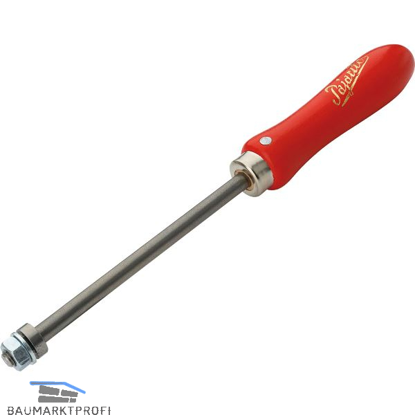 Farbkratzergriff aus 8mm Rundstahl. Rundmutter mit 9mm Außenvierkant, Unterlegscheibe, Sechskantmutter und quervernietetem Holzheft.