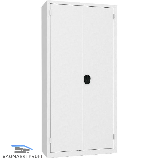 Aus 0,8 mm Stahlbelch geschweißter Büroschrank auf Stahlsockel Höhe 80 mm. Stahl-Flügeltüren mit Verstärkung auf der Seite und schnittsicheren Falten und Scharniere.