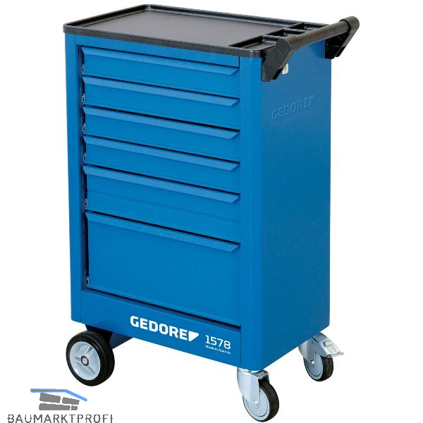 Sechs beidseitig ausziehbare Schubladen. Laden individuell unterteilbar, Zentralverriegelung mit Zylinderschloss, Arbeitsplattform aus ABS-Kunststoff mit 3 Kleinteilefächern,