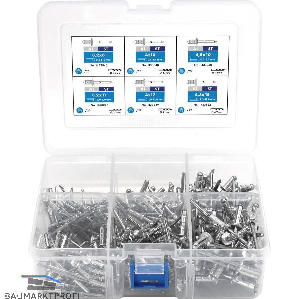 Das GESIPA Blindnietsortiment kompakt AL/ST ist die ideale Lösung für alle, die bei wechselnden Materialstärken eine zuverlässige und flexible Auswahl an Blindnieten zur Hand haben möchten.