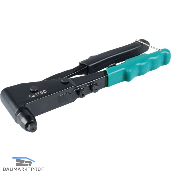 Einfaches Einsteiger Blindniet-Setzgerät. Die Öffnungsfeder schiebt den Hebel automatisch, für eine einfache Verwendung. Verschiedene Größen von Mundstücken sind am Griff angebracht, zusammen mit einem kleinen Schraubenschlüssel. Ein Spannbacken Zusatzset ist im Gehäuse eingearbeitet.