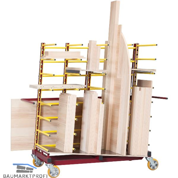 Für den kombinierten Transport von unterschiedlichen Teilen und Platten bis 2,5 m Länge. Zusätzliche Kapazitäten an der Rückseite für die Ladung großflächiger Teile bis ca. 3 x 2 m. Seitlich geneigt. Lagerung Teil an Teil.