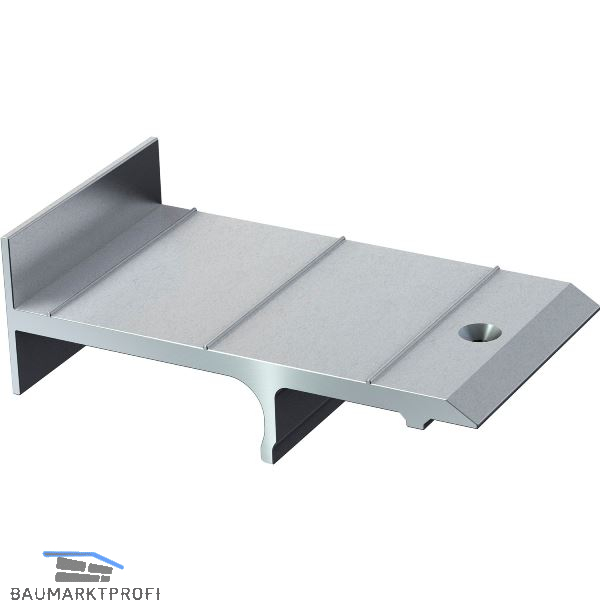 S-Fix-H für die seitliche Fixierung der Platten. Der 5 mm starke Alu-Winkel verhindert die Kippbewegung der Platten bei Kantenbelastung. Er hat die gleiche Tiefe wie der Terrassenlagerfuß, der deshalb beim Wandanschluss nicht eingekürzt werden muss.