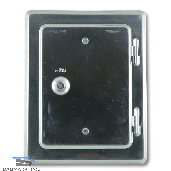 Geprüft und amtlich zugelassen. Aushängbares Türblatt mit abgerundeten Ecken. Zusätzliche Dichtung. Vierkantverschluss (Verriegelung durch Vierkantstift 7 mm). Innere Lichte 140 x 200 mm. Abmessung 226 x 286 mm.