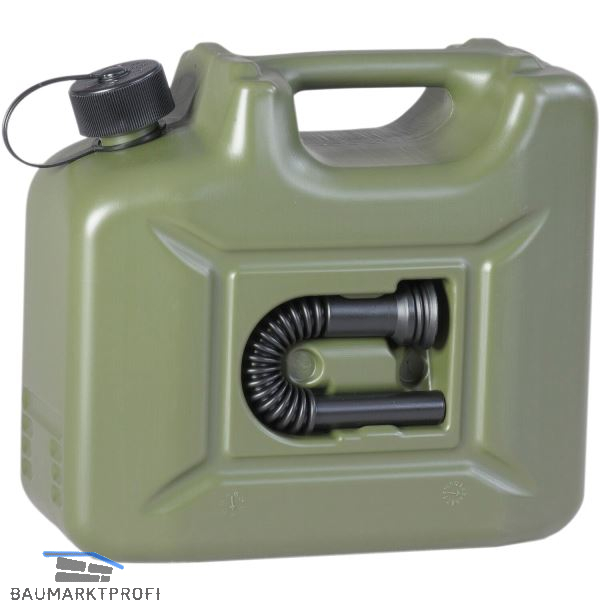 Aus Kunststoff in klassischer Militär-Ausführung. Erfüllt höchste Sicherheitsanforderungen, robust und unempfindlich gegen Schlagwirkung. TÜV-geprüft und E10 geeignet. Im Kanisterkörper integriertem Auslaufrohr und unverlierbarer Kinder-Sicherungsverschraubung. Keine Rostpartikel und geringere Temperaturleitfähigkeit gegenüber Metallkanistern.