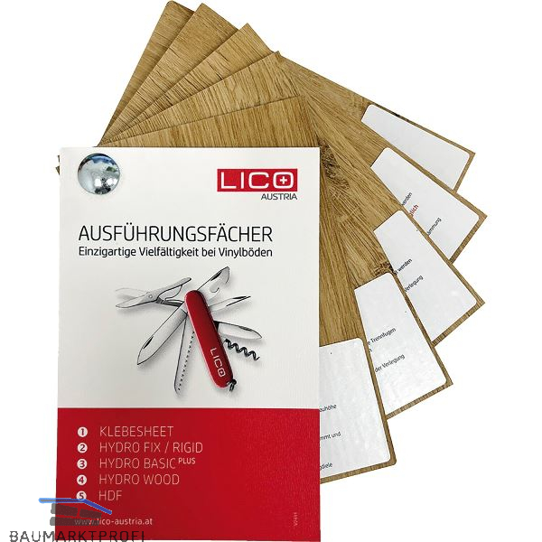 Vinylboden Lico - Ausführungsfächer mit Originalmustern der Aufbauarten (Klebesheet, Hydro Fix/ Rigid, Hydro Basic Plus, Hydro Wood, HDF).