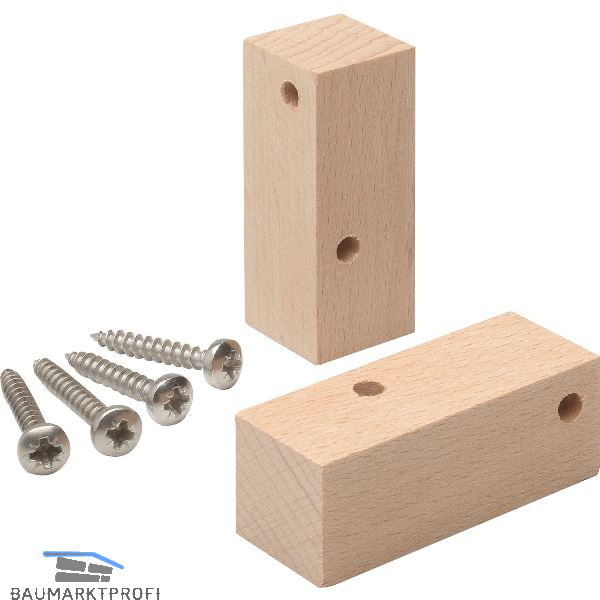 Lieferumfang: 2 Montageklötze vorgebohrt, je 2 Halbrundkopfschrauben 4 x 25 und 4 x 30 mm