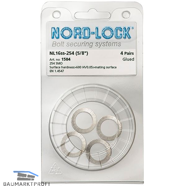 NORD-LOCK®-Sicherungsscheibe aus rostfreiem Stahl mit Keilflächen auf der Innenseite und Radialrippen auf der Außenseite, paarweise geklebt.
