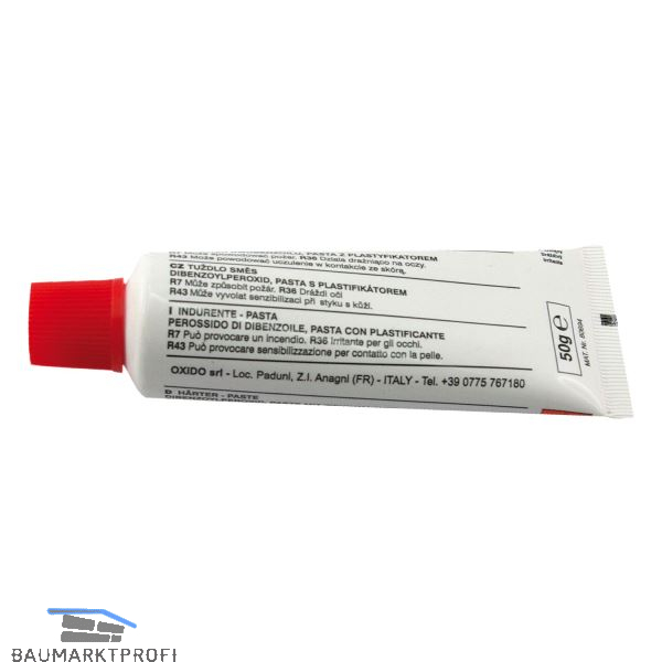 Anwendung:Die Tube optimalerweise auf Raumtemperatur bringen und wie auf dem presto Polyesterspachtel oder Harz angegebenen Mischungsverhältnis mit der Spachtelmasse verrühren.