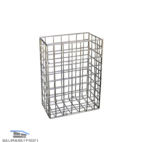 Für Wandmontage oder frei bodenstehend. Oberfläche elektrolytisch poliert. Der Abfalldrahtkorb ist faltbar. Inkl. Edelstahlschrauben und Dübel, damit er in die richtige Form gebracht werden kann.