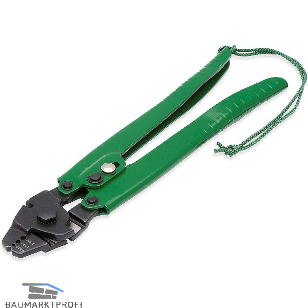 Handpresszange mit Schneide aus gehärtetem, legierten Stahl. Körper gehärtet, Industrie Qualität. Schneidkanten Zuführung vergütet. Zum Schneiden von Drahtseil bis 1,5 mm und Verpressen von ovalen Pressklemmen aus Alu.