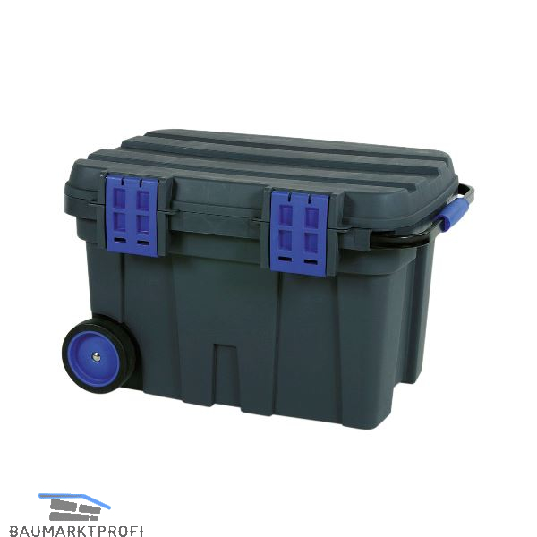 Große Montagebox für die Aufbewahrung bzw. den Transport von größerem Zubehör und Werkzeug. Mit Rädern, Ausziehgriff, 2 Werkzeugträgern, Schnappverschlüssen. Verschließbar mittels Vorhangschlösser. Werkzeuge können am Deckelinneren befestigt werden.