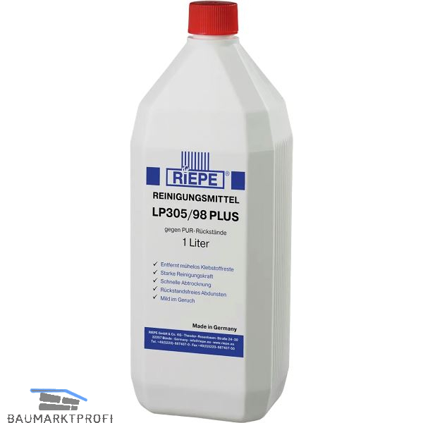 Der Stärkste unter den manuellen Reinigern LP 305/98 PLUS entfernt rückstandslos sogar PUR-Klebereste. Er zeichnet sich vor allem durch seine starke Reinigungskraft und schnelle, rückstandsfreie Abtrocknung aus. Dabei ist dieses Erzeugnis mild im Geruch und hexan- und benzolfrei. Die von RIEPE® entwickelten Spezial-Kunststoffreiniger sind die erste Wahl für die manuelle Reinigung von Kunststoffoberflächen. Durch die Verwendung von ausschließlich hochwertigen Rohstoffen, behaupten sich die Spezial-Kunststoffreiniger von RIEPE® als Premiumprodukte am Markt.