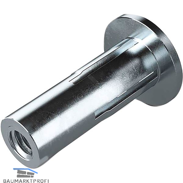 Robuste Blindnietmutter mit geschlitztem Schaft für den einseitigen Einbau in dünnwandige oder weiche Materialien.