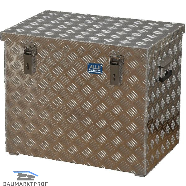 Aluminium-Transportkiste aus Riffelblech, zum Verstauen Ihrer Werkzeuge und sperrigen Gegenständen. Aus legiertem 3 mm Alu-Riffelblech mit rundum geschweißten Nähten, Edelstahlscharniere-Griffe und -Verschlüsse. Mit selbsteinklappenden Sicherheits-Tragegriffen, massive Exzenterverschlüsse mit Ösen für Vorhangschlösser, Staub- und spritzwassergeschützt durch umlaufende Gummidichtung.