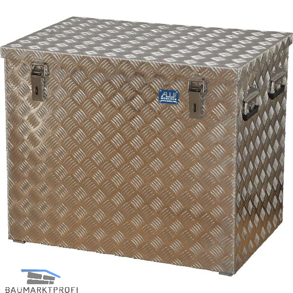 Aluminium-Transportkiste aus Riffelblech, zum Verstauen Ihrer Werkzeuge und sperrigen Gegenständen. Aus legiertem 3 mm Alu-Riffelblech mit rundum geschweißten Nähten, Edelstahlscharniere-Griffe und -Verschlüsse. Mit selbsteinklappenden Sicherheits-Tragegriffen, massive Exzenterverschlüsse mit Ösen für Vorhangschlösser, Staub- und spritzwassergeschützt durch umlaufende Gummidichtung.