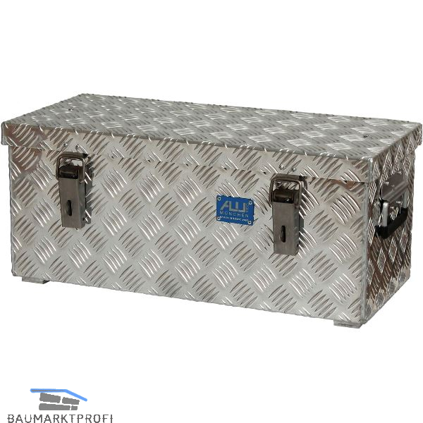 Aluminium-Transportkiste aus Riffelblech, zum Verstauen Ihrer Werkzeuge und sperrigen Gegenständen. Aus legiertem 3 mm Alu-Riffelblech mit rundum geschweißten Nähten, Edelstahlscharniere-Griffe und -Verschlüsse. Mit selbsteinklappenden Sicherheits-Tragegriffen, massive Exzenterverschlüsse mit Ösen für Vorhangschlösser, Staub- und spritzwassergeschützt durch umlaufende Gummidichtung.