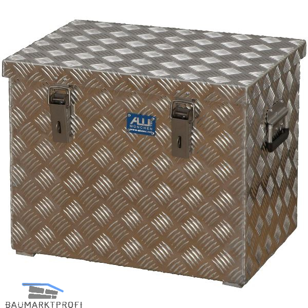 Aluminium-Transportkiste aus Riffelblech, zum Verstauen Ihrer Werkzeuge und sperrigen Gegenständen. Aus legiertem 3 mm Alu-Riffelblech mit rundum geschweißten Nähten, Edelstahlscharniere-Griffe und -Verschlüsse. Mit selbsteinklappenden Sicherheits-Tragegriffen, massive Exzenterverschlüsse mit Ösen für Vorhangschlösser, Staub- und spritzwassergeschützt durch umlaufende Gummidichtung.