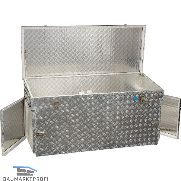 Aluminium-Transportkiste aus Riffelblech, zum Verstauen Ihrer Werkzeuge und sperrigen Gegenständen. Aus legiertem 3 mm Alu-Riffelblech mit rundum geschweißten Nähten, Edelstahlscharniere-Griffe und -Verschlüsse. Mit selbsteinklappenden Sicherheits-Tragegriffen, massive Exzenterverschlüsse mit Ösen für Vorhangschlösser, Staub- und spritzwassergeschützt durch umlaufende Gummidichtung.
