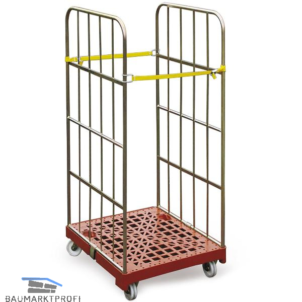 Gitterwände galvanisch verzinkt. Kunststoff Grundplatte mit innenliegendem Stahlblechrahmen. 2 Lenk- und 2 Bockrollen, 2 Seitenwänden, ohne Gummispanner.