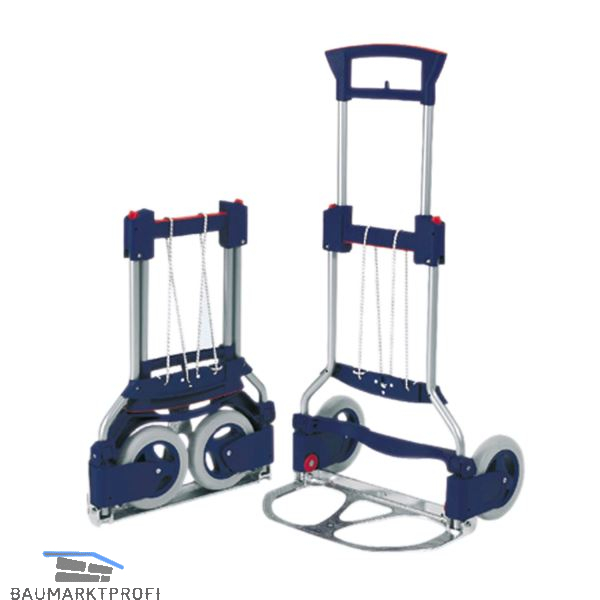Aluminium, zusammenklappbar, Breite 490 mm. Zusammengeklappt ist die Karre ein handliches Paket von nur 5,5 cm Stärke. Passt daher in jede Niesche oder in jeden Kofferraum.