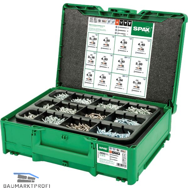 Ein komplettes Schraubenset mit 2.900 Schrauben in 12 Abmessungen beherbergt unser SPAX Box systainer. Die modular gestaltbaren Systainer kennen Sie auch als Aufbewahrungsboxen für Elektrowerkzeuge, die untereinander ganz einfach zu verbinden sind. Der SPAX Box systainer wird so zum integralen Bestandteil Ihrer Werkzeugboxen, Sie haben immer alles, was Sie brauchen dabei und perfekt geordnet zur Hand.