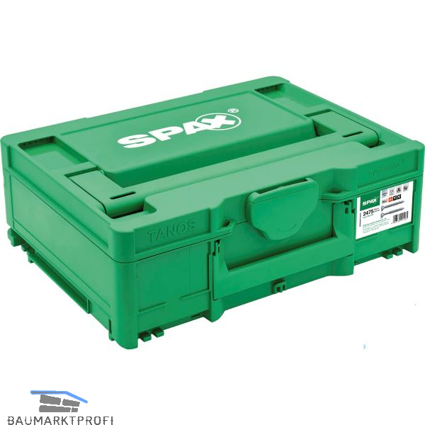 Ein komplettes Schraubenset mit 2.475 Schrauben in 12 Abmessungen beherbergt unser SPAX Box systainer. Die modular gestaltbaren Systainer kennen Sie auch als Aufbewahrungsboxen für Elektrowerkzeuge, die untereinander ganz einfach zu verbinden sind. Unser SPAX Box systainer wird so zum integralen Bestandteil Ihrer Werkzeugboxen, Sie haben immer alles, was Sie brauchen dabei und perfekt geordnet zur Hand. Neben den Schrauben mit T-STAR plus, Senkkopf- und WIROX-Ausstattung gehört auch ein fünfköpfiges T-STAR plus T20-Bit-Team zur Ausstattung. Das bedeutet für Sie: Maximale Ordnung im Systainer, Werkzeuge und Schrauben werden zur kompakten Kombination für die Baustelle.