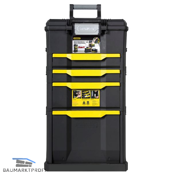 Modular aufgebaute Rollende Werkstatt aus robustem Kunststoff mit drei entnehmbaren, tragbaren Werkzeugboxen mit Schnellverschluss. Teleskopgriff aus Aluminium, Schubladen mit kugelgelagerten Schienen. Robuste 7" Schwerlast-Räder.