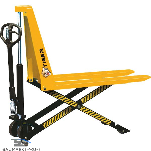 Scheren-Hochhubwagen mit manuellem Hub, wartungsfreie Einzylinder-Hydraulik. Schnellhubfunktion bis 150 kg. Für ergonomisches Arbeiten in richtiger Arbeitshöhe, ergonomische Gummihandgriffe. Sicherheitsstützen garantieren festen Stand bei angehobenen Gabeln. Lenkräder und Gabelrollen einfach aus Polyurethan. Lenkeinschlag 180º.