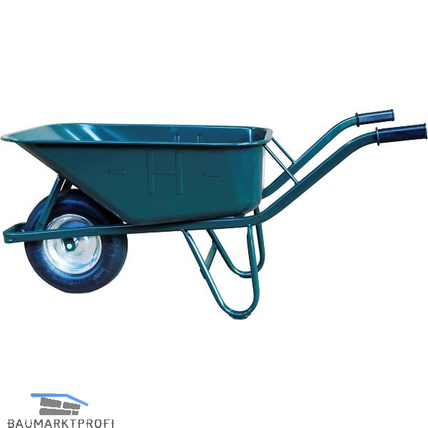 100 L pulverbeschichtete Tiefziehmulde mit H-Sicherheitsmulden, randstarker pulverbeschichteter Ovalrohrrahmen mit Mulde verschweißt, Muldenabstützung vorne und hinten, Schutzkufen und Querverbindung an den Füßen, 2-fache Rahmenquerverbindung unter dem Muldenboden, Luftrad 400 x 100 mm, mit Stahlfelge und Kugellager.