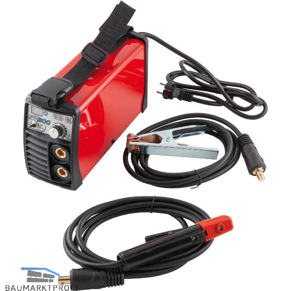 Lieferung inkl. Massekabel 3m mit Klemme, Elektrodenhandkabel 3m, Tragegurt, Bedienungsanleitung, im Karton.