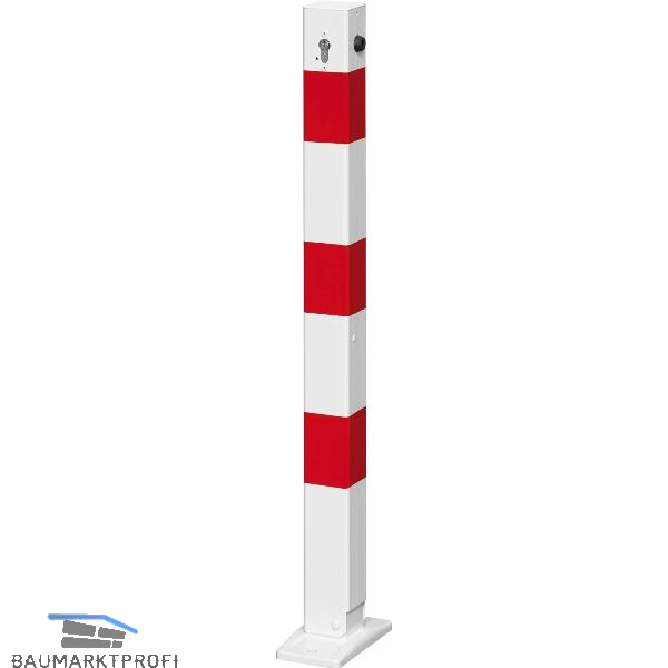Solider und stabiler Absperrpfosten zur Begrenzung von Flächen, Wegen und Fußwegsicherung. Vierkantrohr 70 x 70 mm mit Stahlkappe. Zum Umlegen mit Profilzylinderschloss.