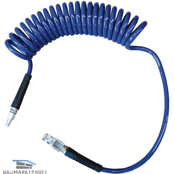 PUR-Polyurethan Spiralschlauch für Industrie, Werkstatt und Gewerbe. Hochflexibel und knickfest, silikonfrei, UV-beständig ohne Weichmacher (wird daher nicht spröde). Arbeitsdruck: 10 bar, Sprengdruck: 40 bar, 2 gerade Enden mit Drehgelenk, kein Eindichten notwendig.