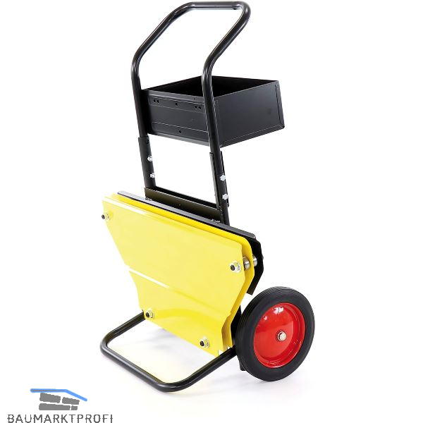 Fahrbar, mit großen Laufrädern ø 250 mm, durchgehender Haltebügel, mit Geräteablage. Stahlbandfächer (Breite) kann selbst verändert werden. Für Bandbreite 13 bis 32 mm scheibengewickeltes Stahlband bis Außen ø 600 mm.