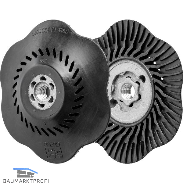 Mit diesem Stützteller können COMBICLICK-Werkzeuge auf handelsüblichen Winkelschleifern eingesetzt werden. Speziell entwickelter Stützteller mit einer stabilen Halterung auf der Rückseite des Werkzeuges. Die besondere Geometrie der Kühlschlitze sorgt für einen hohen Luftdurchsatz, wodurch die thermische Belastung des Schleifmittels und des Werkstückes deutlich reduziert wird. Das Schnellspannsystem, die robuste Halterung, die sichere Arretierung des Werkzeuges und das integrierte Kühlsystem bewirken gegenüber herkömmlichen Werkzeugen eine bis zu 30 % geringere Werkstücktemperatur, 25 % höhere Zerspanungsleistung, 30 % höhere Standzeit und eine bessere Ausnutzung des Schleifmittels. Härte CC-GT (mittel) = schwarz.
