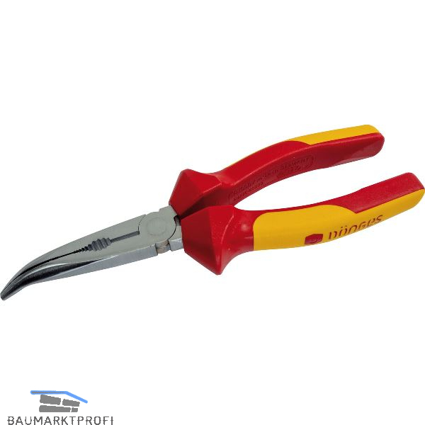 40º gebogene Backen, Schneiden zusätzlich induktiv gehärtet, Schneidehärte ca. 60 HRC; für weichen und harten Draht, mit Schneide und flachrunden Spitzen, geriffelte Greiffläche, 2-Komponentenhülle mit Abgleitschutz, VDE geprüft bis 1000 Volt.