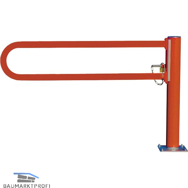 Alle Stahlbauteile feuerverzinkt. Schwenkaufsatz aus Stahlrohr 121,0 x 4,0 mm, Hauptstütze aus Stahlrohr 101,6 x 2,9 mm, einteiliger Stahlrohr-Sperrbügel 60,3 x 2,9 mm. Holmabstand mittig 300 mm. Befestigung durch Aufschrauben der Bodenplatten 250 x 250 mm. Schließungsmöglichkeiten für Vorhangschloss. Höhe über Flur 1000 mm (Oberkante Sperrbalken).