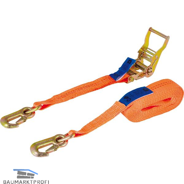 Zweiteiliger Zurrgurt mit Ratsche und Karabiner.