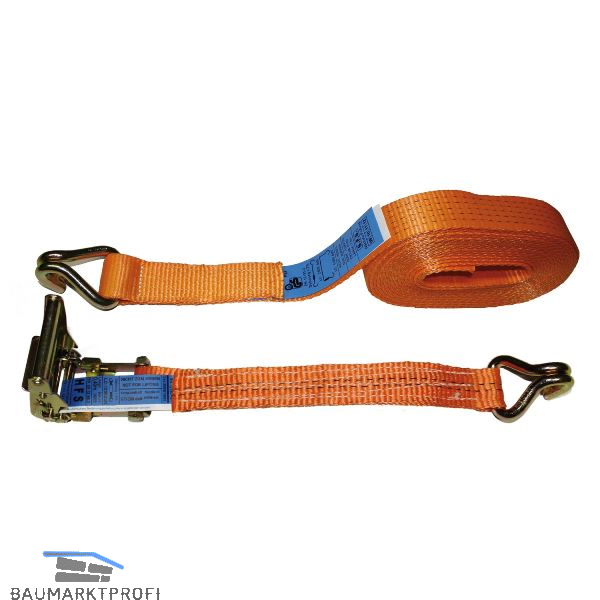 Gurtbreite (mm): 50 Gesamtlänge (m): 8 Länge: kurzer Teil 0,4 m und langer Teil 7,6 m Ausführung: 2-teilig mit Ratsche, beidseitig mit Spitzhaken Zugkraft: gerade 2000 kg, U-Form 4000 kg Farbe: Orange Norm: EN 12195-2 Type: ZG-4-PH-SR