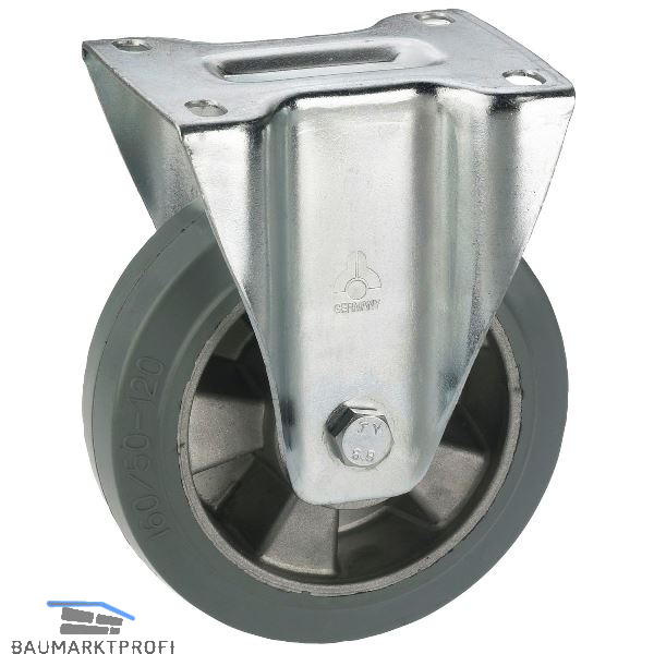 Wabenfelge aus Aluminium-Druckguss mit grauem (bei Ø 250 mm mit schwarzem) Elastik-Vollgummireifen und Kugellager im Drehkranz.