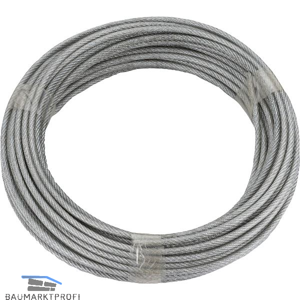 PVC Mantel schützt vor Witterungseinflüssen und mechanischer Beschädigung etc. Drahtseil besteht aus 6x7 Litzen + 1 Fasereinlage.