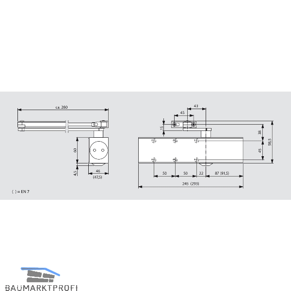 Schließgeschwindigkeit in zwei voneinander unabhängigen Bereichen und Endschlag stufenlos einstellbar. DIN-L und DIN-R verwendbar.