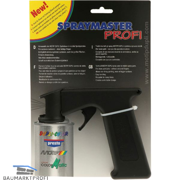 Verwandelt alle MOTIP DUPLI Sprühdosen in mobile Sprühpistolen. Für sauberes Lackieren - ohne farbige Finger. Ermöglicht ermüdungsfreies Lackieren, auch bei großen Flächen. Einfache Anwendung. Viele Male wiederverwendbar. Schafft kontrollierbare Dosiermöglichkeit.