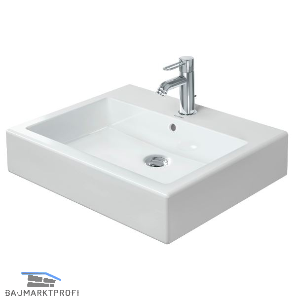 Marke: Duravit Type: 0454600027 Ausführung: rechteckig Material: Keramik Farbe: Weiß Einbauvariante: Aufsatz Unterbau ab (mm): 600 Außenmaß (mm): 600 x 470 x 165 Beckengröße (mm): 530 x 310 x 130 Grundausstattung: mit Überlauf, 1 Bohrloch, ohne Ventil, ohne Befestigung, ohne Siphon, Rückwand und Unterseite geschliffen