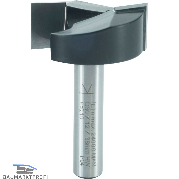 Planfräser, der umfang- und stirnschneidend ausgeführt ist. Er eignet sich besonders zum Einfräsen von großflächigen Scharnieren sowie zum Planfräsen von Holz- oder Kunststoffumleimern. Auch zum Bearbeiten von größeren ebenen Flächen geeignet.