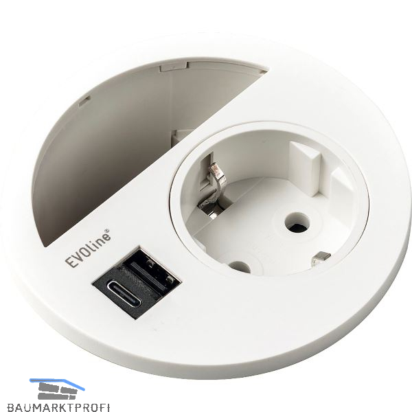 EVOline Circle80 kombiniert eine Steckdose, zwei USB-Charger und einen Kabeldurchlass in einem Element und ist so die perfekte, kompakte Lösung für Schreib-, Besprechungs- oder Konferenztische.
