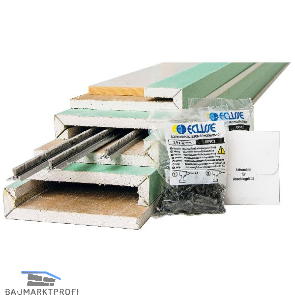 Die Planbox aus Gipskarton-Formteilen bietet eine einfache Möglichkeit um die Schiebetüreinbaukästen UNICO für den Trockenbau optisch wandbündig zu verkleiden. ECLISSE UNICO-Modelle für die fertigen Wandstärken 125 mm. Die passgenauen Formteile sind in Feuchtraumqualität GKBI 12,5 mm ausgeführt, inkl. Staubbürsten in Alu-Profilen, GK-Schrauben für zweite Belegung (3,9 × 32) und weißer Anschlagplatte aus MDF. Geeignet zur Montage von Schließblechen.