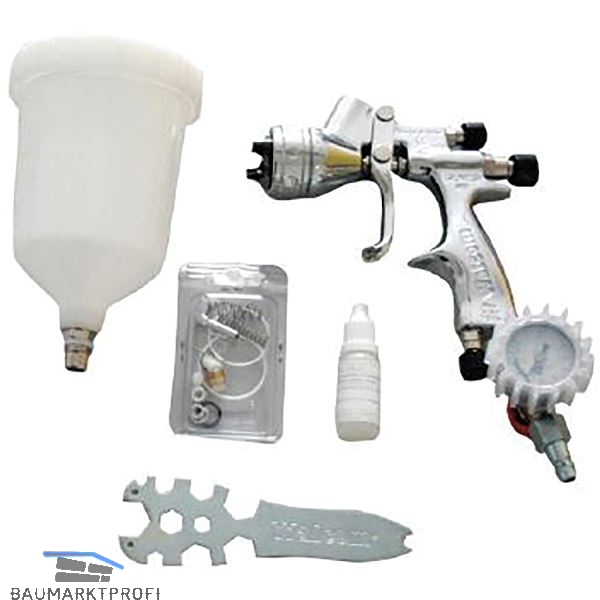 Farbspritzpistole zur Erzielung einer optimalen Oberflächengüte von Dekorfarben, Industrielacken, KFZ ... Profigerät für Flach- und Rundstrahl, mit stufenloser Strahlbreiten- und Luftmengenregulierung. PTFE-dichtungen selbstschmierend.